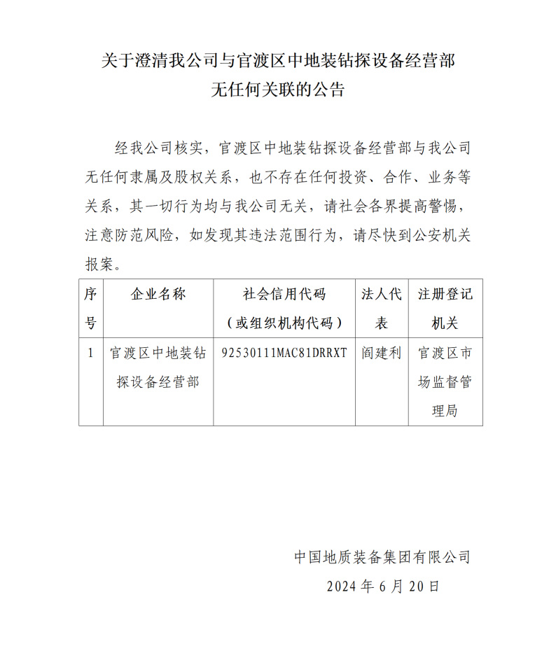 关于澄清我公司与官渡区中地装钻探设备经营部无任何关联的公告